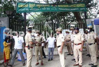 Photo Caption : Police personnel security during MLC elections results at Maharani College, in Bengaluru on Tuesday 14th December 2021