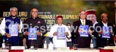Photo Caption : Governor Thawar Chand Gehlot releasing "Sustainable Development" report (SDR) 2021 during inauguration of Bengaluru Sustainable conclave at a private hotel, also seen are Prof. Dr. C Rajkumar, Founding Vice Chancellor, OP Jindal Global University, Sudhir Mishra, Founder and Managing Partner, Trust Legal, Prof. Dr. MV Rajeev Gowda and K Jairaj, Former Additional Chief Secretary, GoK , in Bengaluru on Wednesday 15th December 2021
