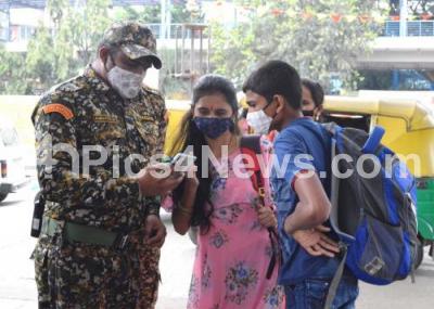 Photo Caption : BBMP Marshals and police impose fine on public at Majestic Bus stand, who were found not wearing masks amid Coronavirus pandemic, in Bengaluru on Wednesday 15th December 2021