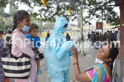 Health workers collect swab samples for COVID 19 tests at Majestic Bus stand, amid ongoing Coronavirus pandemic, in Bengaluru on Wednesday 15th December 2021