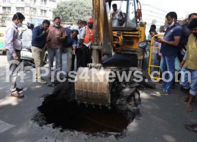 Photo Caption : A part of JC road caved in and caused major traffic jam, in Bengaluru on Thursday 16th December 2021