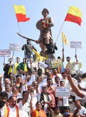 Event Description : Members of Kuruba Association protesting against the vandalising of Rayanna statue in Belagavi and demanding to ban the MES in Karnataka state, in Bengaluru on Monday 20th December 2021