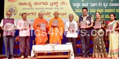 Photo Caption : Sri Nirmalananda Swamiji of Adichunchanagiri Mutt with Kannada Activist and Writer Janagere Venkataramaiah, Prof. M Krishnegowda, Dr. PK Rajashekar, Dr. KR Sandhya Reddy and others during a book release of "Mannina Hanate" at Ravindra Kalakshetra, in Bengaluru on Saturday 25th December 2021