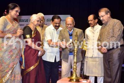 Dr. Hampa Nagarajaiah with Writer LG Meera Dr. Narahalli Balasubramanya, BR Lakshman Rao, YK Muddukrishna during inauguration of "Geeta Gaurava" for Dr. NS Lakshminarayana Bhatt at Ashwath Kalabhavan, in Bengaluru on Sunday 26th December 2021