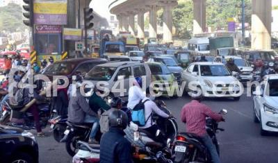 Photo Caption : Traffic jam at Tumkur road due to Tumkur Road Highway flyover service work, in Bengaluru on Sunday 26th December 2021