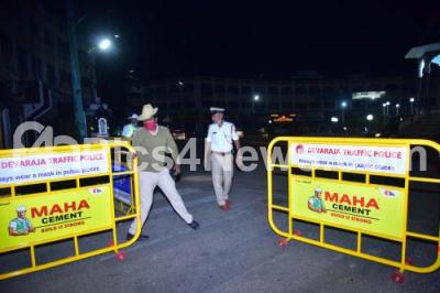 Photo Caption : Mysuru City police block roads with barricades and stepped up patrolling to ensure strict implementation of night curfew from tonight till 7th January 2022, between 10 pm to 5 will be imposed amid fears of the Omicron variant of coronavirus spreading across the Karnataka state, in Mysuru on Tuesday 28thDecember 2021