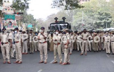 Photo Caption : Police personnel security at SBM circle during Kannada Rakshana Vedike members rally to demand a complete ban on Maharashtra Ekikaran Samiti (MES) over recent issues in Belagavi, in Bengaluru on Thursday 30th December 2021