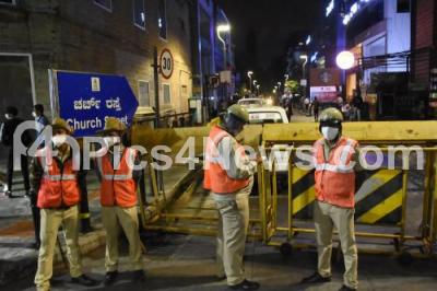 Police personnel barricade MG Road and Brigade Road, as the Karnataka government has restricted the public to celebrate new year outdoors due to Covid-19 pandemic, in Bengaluru on Friday 31st December 2021