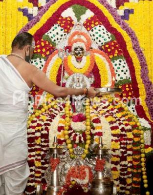 Photo Caption : Priest performing pooja to goddess Banashankari at Banashankari Temple, on the occasion of New Year 2022 , in Bengaluru on Saturday 1st January 2022