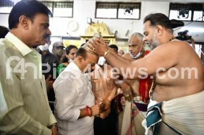 Photo Caption : CM Basavaraj Bommai with Minister Munirathna visited the Tirumala Tirupati Devasthanam Temple in Vyalikaval, to seek blessings on the occasion of New Year 2022, in Bengaluru on Saturday 1st January 2022