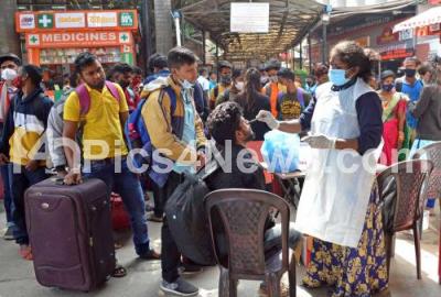 Photo Caption : Health workers collect swab samples for COVID 19 tests at Bengaluru City Railway station, amid Omicron Coronavirus pandemic, in Bengaluru on Wednesday 5th January 2022