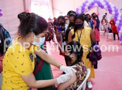 Photo Caption : Health workers administer a dose of the COVID-19 vaccine to students at Malleshwaram, during a vaccination drive for people in the 15 to18 years age group, in Bengaluru on Wednesday 5th January 2022