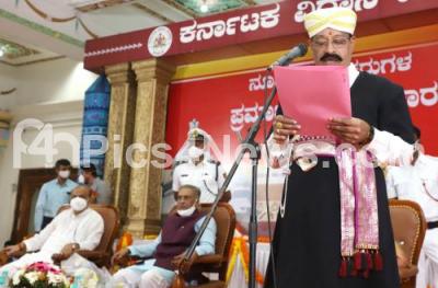 Photo Caption : BJP MLC Suja Kushalappa taking oath during newly elected MLCs swearing in ceremony at Banquet Hall, Vidhana Soudha, also seen are CM Basavaraj Bommai and Council Chairman Basavaraj Horatti, in Bengaluru on Thursday 6th January 2022