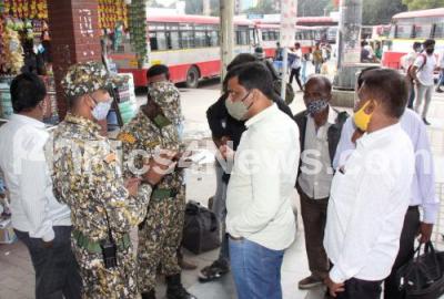 Photo Caption : BBMP Marshals impose fine on public at Majestic Bus stand, who were found not wearing masks amid Coronavirus pandemic, in Bengaluru on Friday 7th January 2022