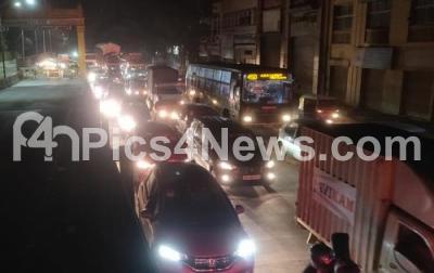 Photo Caption : Heavy traffic jam on Mysore road during the state wide weekend lockdown in the wake of the COVID-19 pandemic, in Bengaluru on Friday 7th January 2022