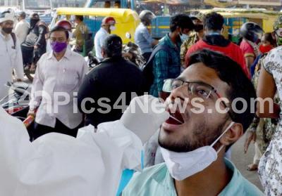 Photo Caption : Health workers collect swab samples for COVID 19 tests at KR Market, amid ongoing Coronavirus pandemic, in Bengaluru on Wednesday 12th January 2022