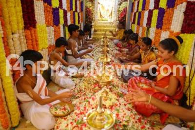 Photo Caption : Children offered Laksharchana seva to show their unique gesture of devotion by chanting one lakh names of the Lord in front of Sri Srinivasa Govinda at ISKCON temple, on the occasion of Vykunta Ekadashi festival, in Bengaluru on Thursday 13th January 2022