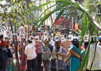 Photo Caption : BBMP workers and people collecting sugarcane during Sankranti Sambrama with BBMP pourakarmika workers and distributed free Sesame, Jaggery and Sugarcane to them, in Bengaluru on Friday 14th January 2022