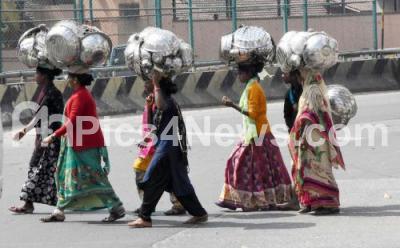 Photo Caption : Women carrying domestic utensils for sale on Mysuru road during the state-wide weekend lockdown in the wake of the Coronavirus Pandemic, in Bengaluru on Sunday 16th January 2022