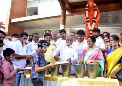 Photo Caption : Minister V Somanna distributed free food during Dasoha Dina as a part of Dr. Sri Shivakumar Swamiji death anniversary at Vijaya Nagar, in Bengaluru on Friday 21st January 2022