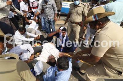 Event Description : Aam Aadmi party members staged a protest against the state government for sharmila who died due to a pothole road at anjana Nagar , Magadi road, in Bengaluru on Monday 31st January 2022