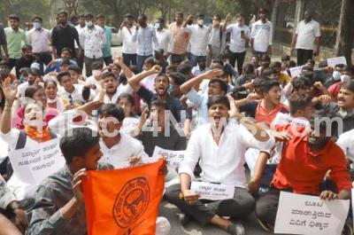 Photo Caption : ABVP activists protesting in front of Bangalore University campus against the delay of issuing marks cards to the students from past two years, in Bengaluru on Tuesday 1st February 2022
