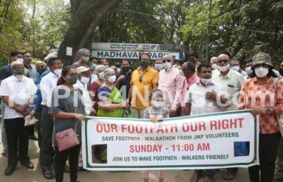 JMP Volunteers along with MLA Uday Garudachar participating in save footpath walkathon to create awareness Our Footpath Our Right for better footpath for public at Madhavan Park, in Bengaluru on Sunday 13th February 2022