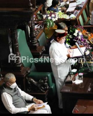 Photo Caption : Governor of Karnataka Thaawar Chand Gehlot addressing during the Joint session at Vidhana Soudha, also seen are Council Chairman Basavaraj Horatti and Speaker Vishweshwar Hegde Kageri, in Bengaluru on Monday 14th February 2022