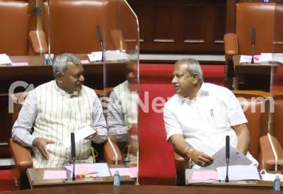 Photo Caption : Ministers ST Somashekar and Byrathi Basavaraju during Council session at Vidhana Soudha, in Bengaluru on Tuesday 15th February 2022