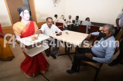 Event Description : A humanoid waitress serves customers at Hotel Siddhartha in Mysuru, the humanoid waitress named Robo Sundari is attired in traditional Mysore silk saree with bindi, necklace and bangles, welcomes the customers and serves food and water at the tables, in Mysuru on Tuesday 15th February 2022
