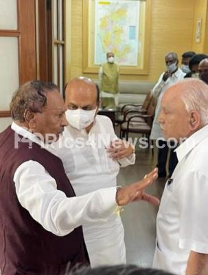 Photo Caption : CM Basavaraj Bommai with Former CM BS Yediyurappa and Minister KS Eshwarappa during Assembly session at Vidhana Soudha , in Bengaluru on Wednesday 16th February 2022