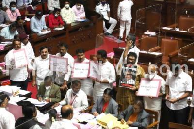 Photo Caption : Congress MLCs protesting against BJP Minister KS Eshwarappa on his statement on National Flag during Council session at Vidhana Soudha, in Bengaluru on Friday 18th February 2022