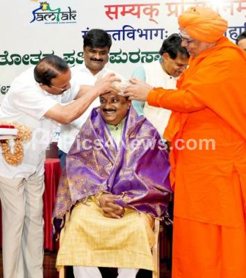 Photo Caption : Sri Chandrashekar Shivacharya Swamiji and Former Union Minister DV Sadananda Gowda presenting "Samskrutasevavrati" award to Prof. Srinivasavarakhedi during a program at Sindhi College, in Bengaluru on Sunday 20th February 2022