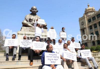 Photo Caption : JDS MLAs and MLCs protesting against BJP and Congress party at Gandhi Statue, Vidhana Soudha, in Bengaluru on Monday 21st February 2022