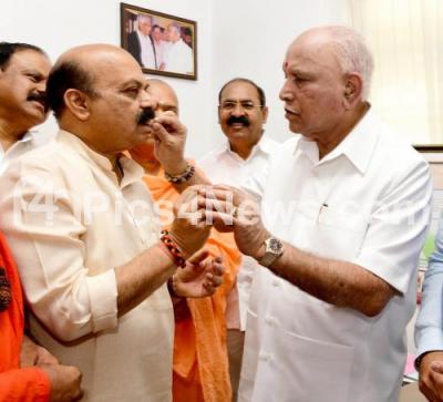 Photo Caption : Former CM and BJP Senior leader BS Yediyurappa being greeted by CM Basavaraj Bommai during BS Yediyurappa 79th birthday celebrations at his residence, in Bengaluru on Sunday 27th February 2022