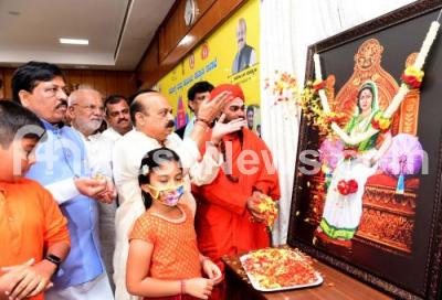 Event Description : CM Basavaraj Bommai with Ministers Sudhakar, Murugesh Nirani and others paid floral tribute to Keladi Chennamma portrait on her jayantotsava at CM Office, in Bengaluru on Sunday 27th February 2022