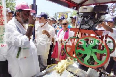 Photo Caption : KPCC President DK Shivakumar and congress leaders drinking sugarcane milk during 2nd of the 2.0 padayatra from Mekedatu to Bengaluru to demand the implementation of Mekedatu project, in Bidadi on Monday 28th February 2022