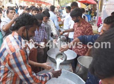 Photo Caption : Volunteers distributed butter milk and Paanaka for the devotees at Kaadu Malleswaram Temple, on the occasion of Maha Shivaratri Festival, in Bengaluru on Tuesday 1st March 2022