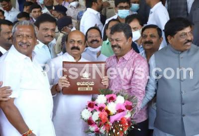 Photo Caption : Chief Minister of Karnataka Basavaraj Bommai arriving with the budget briefcase to present the budget for the Year 2022-23 at Vidhana Soudha, in Bengaluru on Friday 4th March 2022