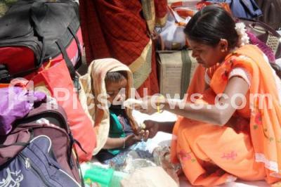 Photo Caption : A mother feeding food to her kid during members of Karnataka State Anganwadi Workers Association protest to fulfill their various demands at Freedom Park, in Bengaluru on Saturday 5th March 2022