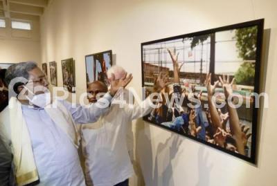 Photo Caption : Former CM and CLP leader Siddaramaiah looking at the Portrayal of Pandemic Havoc on Ordinary people photo exhibition of photojournalist Venkatesh at Chitrakala Parishat , in Bengaluru on Monday 14th March 2022