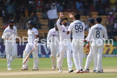 Event Description : Indian Team beat Sri Lanka by 238 runs in the 2nd Test Match at Chinnaswamy Stadium, India won the series, India, Monday, March 14, 2022. Photo by: Surjeet Yadav, Bangalore News Photos.