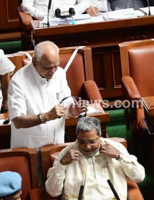 Photo Caption : Former CM and BJP leader BS Yediyurappa interacting with Former CM and CLP Leader Siddaramaiah during Assembly session at Vidhana Soudha, in Bengaluru on Wednesday 23rd March 2022