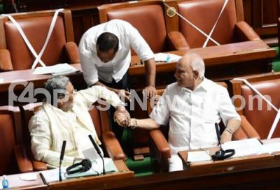 Photo Caption : Former CM and BJP leader BS Yediyurappa interacting with Former CM and CLP Leader Siddaramaiah during Assembly session at Vidhana Soudha, in Bengaluru on Wednesday 23rd March 2022