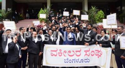 Photo Caption : Members of Advocates Association protesting against the threat posed to chief justice on Hijab issue , in Bengaluru on Wednesday 23rd March 2022