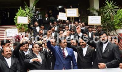 Members of Advocates Association protesting against the threat posed to chief justice on Hijab issue , in Bengaluru on Wednesday 23rd March 2022