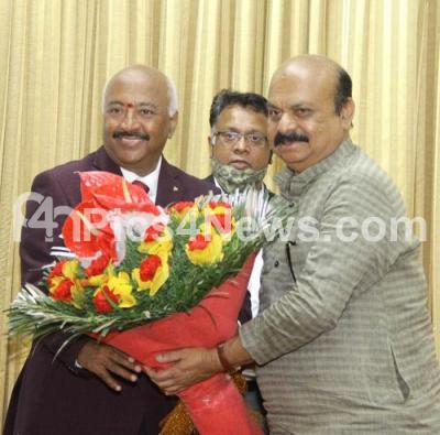 Photo Caption : Deputy Lokayukta of Karnataka Justice KN Phaneendra being greeted by CM Basavaraj Bommai at Raj Bhavan, in Bengaluru on Tuesday 29th March 2022