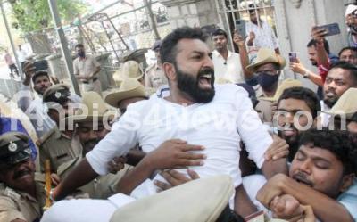 Event Description : KPCC Youth Congress members and its President Mohammed Haris Nalapad detained by Police during their protest against Home Minister Araga Jnanendra, in Bengaluru on Thursday 7th April 2022