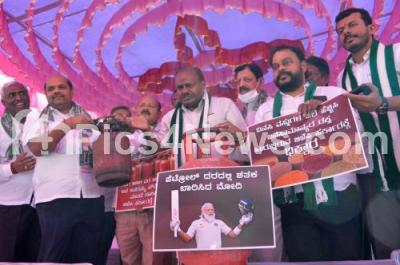 Photo Caption : Former CM HD Kumaraswamy with JD(S) MLAs and MLCs protesting against price hike in LPG and Fuel rates, in Bengaluru on Friday 8th April 2022