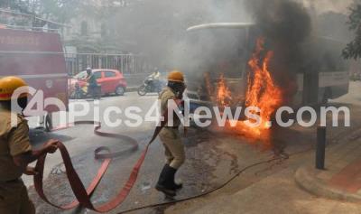 Firemen trying to douse off the fire which had got caught in the moving BMTC bus at KR Circle due to short circuit, in Bengaluru on Saturday 9th April 2022